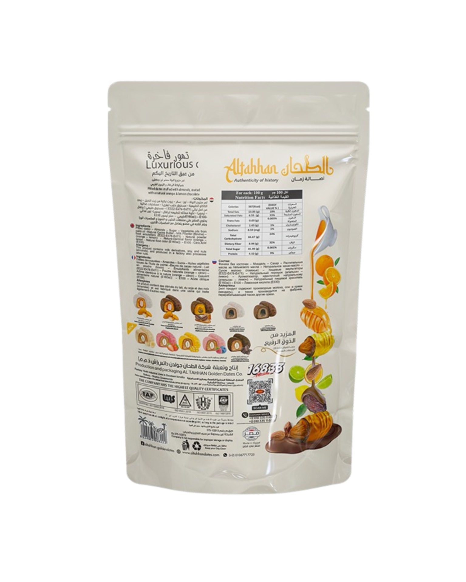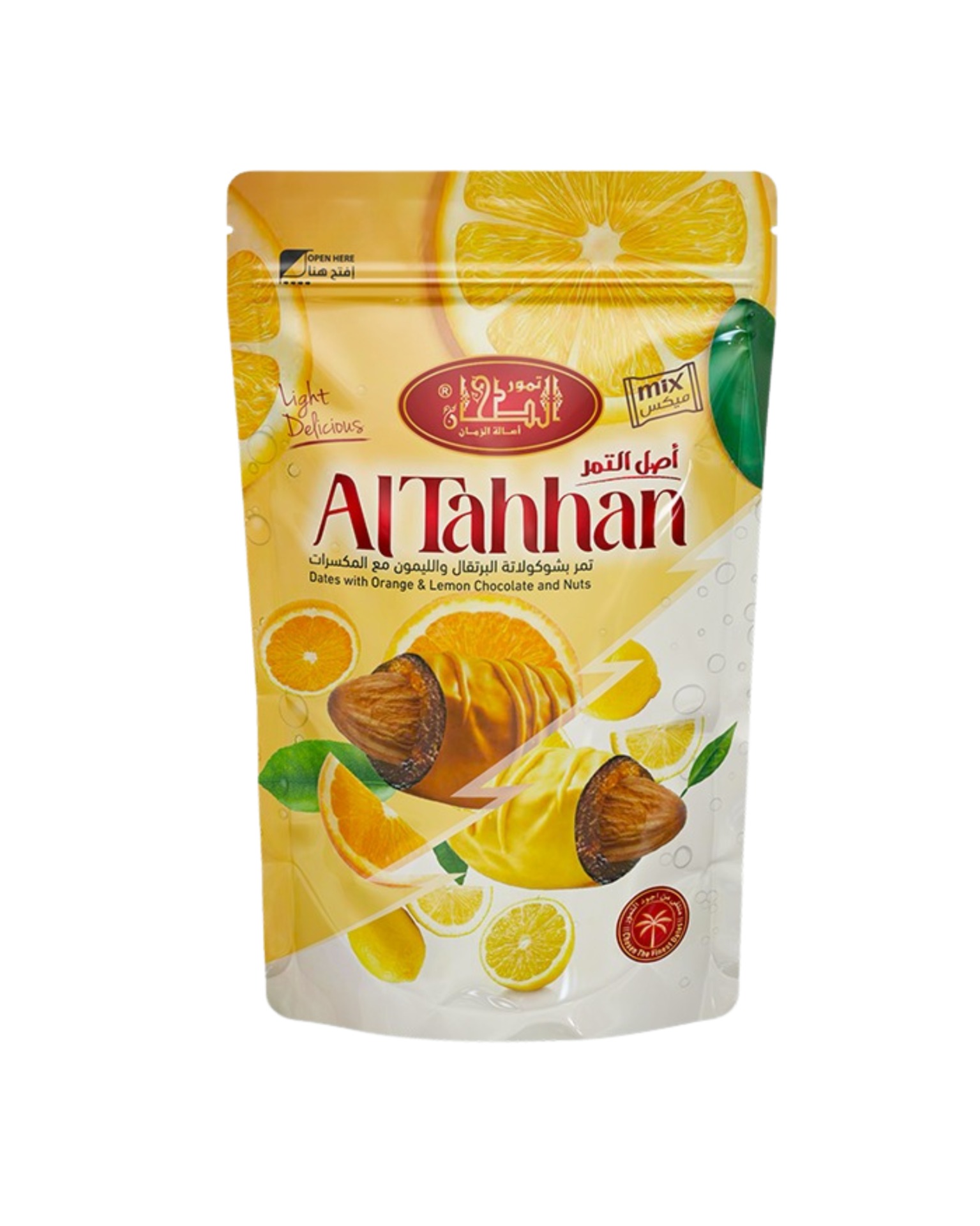 Objevte jedinečnou kombinaci prémiových datlí, svěží citrusové chuti a křupavých ořechů. Šťavnaté datle AlTahhan jsou obalené pomerančovou a citronovou čokoládou, která jim dodává osvěžující tón a vytváří perfektní spojení sladkého a svěžího. Ideální volba pro ty, kteří chtějí vyzkoušet něco netradičního z egyptských specialit.