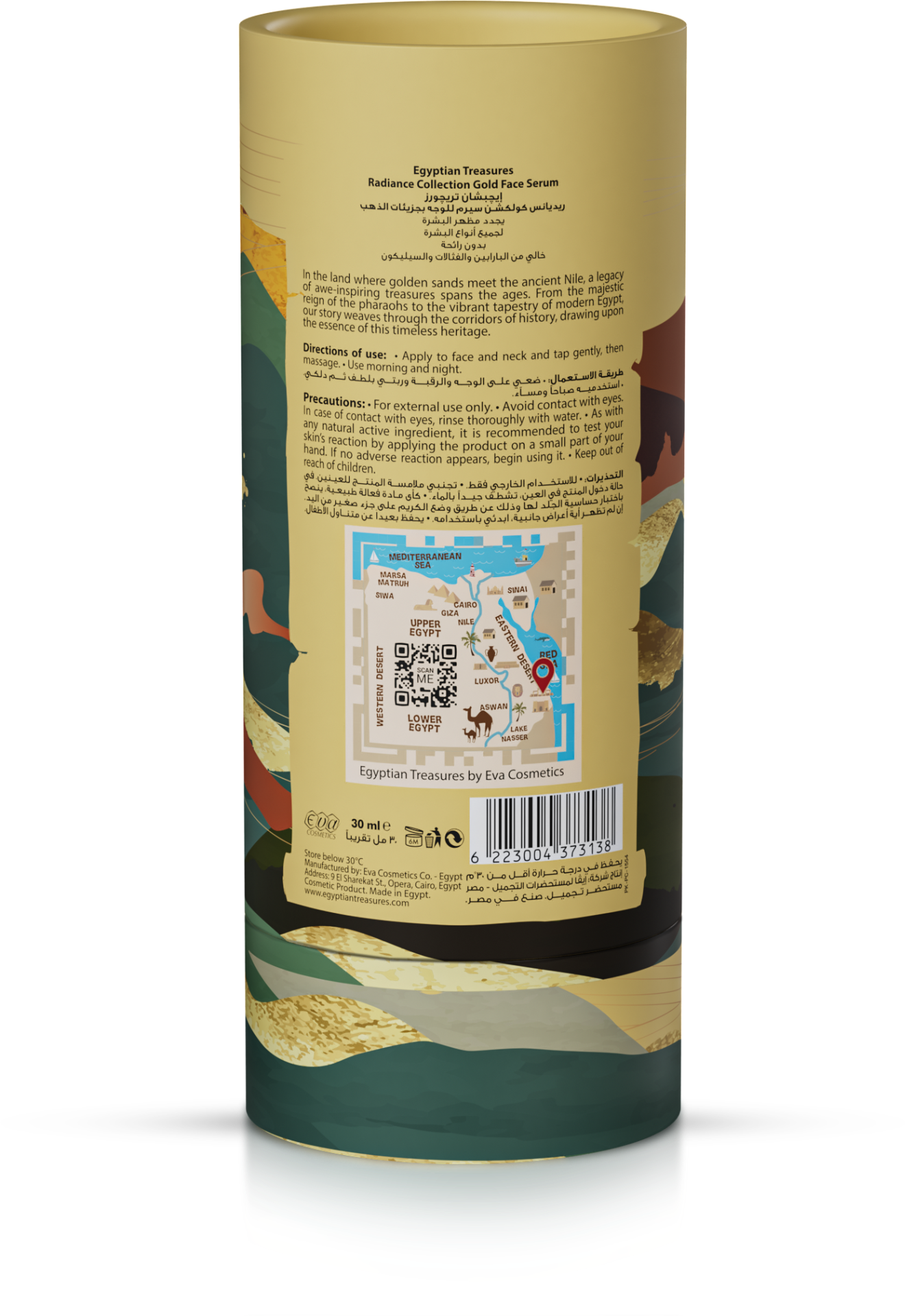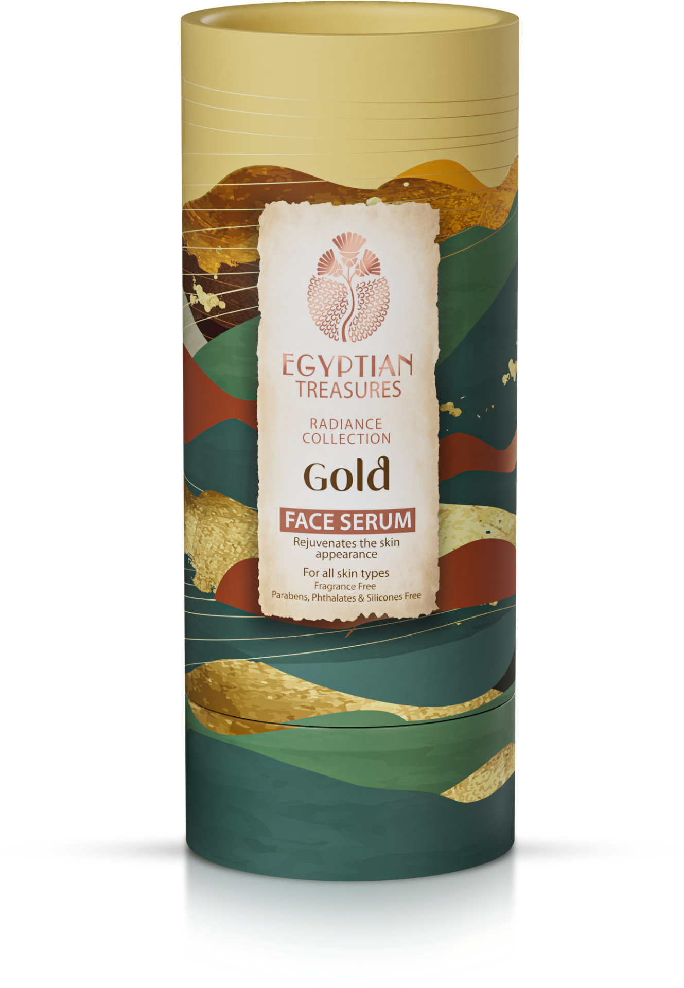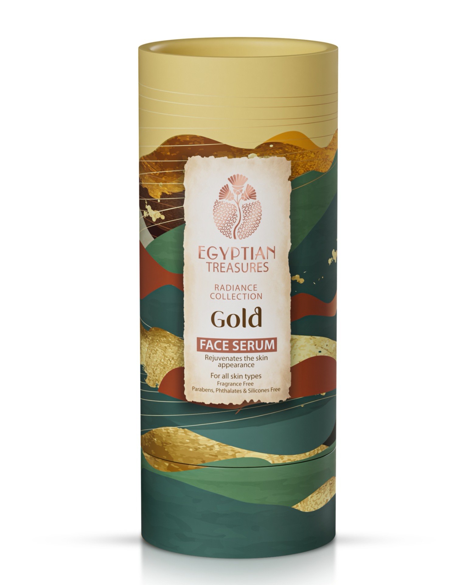 Součástí balení je originální tubus s egyptským designem, který podtrhuje prémiový charakter produktu a odkazuje na egyptskou historii těžby zlata.